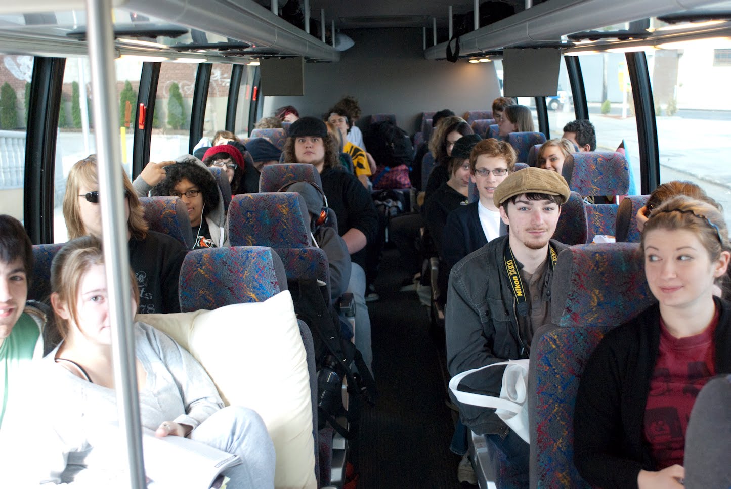 A really bad shot of everyone on the bus outside the hotel.